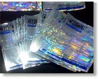 We also offer a range of designs in Holographic Pouches with customized visual effects. We have a plethora of colors to make the Holographic Pouches attractive. We provide another way of achieving more security with Holographic pouches. This is done by inserting the Hologram label prior to laminating the pouch using a custom imprinted Hologram label, providing customized security. We offer both standard and customized pouches for a whole range of uses.